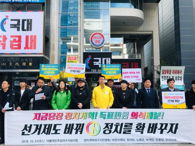 노동당 녹색당 민중당 우리미래 바른미래당 정의당 등 6개 정당의 대구시당과 정치개혁대구시민행동 대표들은 지난 달 31일 더불어민주당 대구시당 앞에서 기자회견을 열고 "정치개혁의 시작은 선거제도 개혁에서"라고 주장하며 "연동형비례대표제 도입하라"고 요구했다.