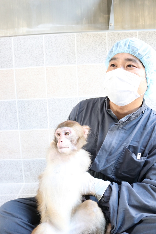 ▲붉은털 원숭이와 사육사 ⓒ한국생명공학연구원