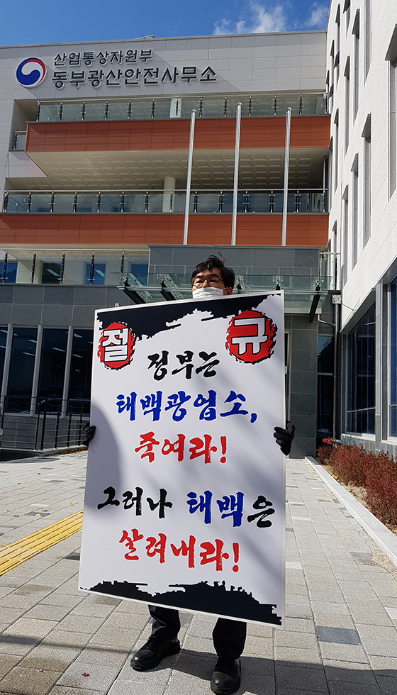 ▲지난달 29일 태백시 황지동 산업통상자원부 동부광산안전사무소 앞에서 태백광업소 관계자가 1인 시위를 펼치고 있다. ⓒ프레시안