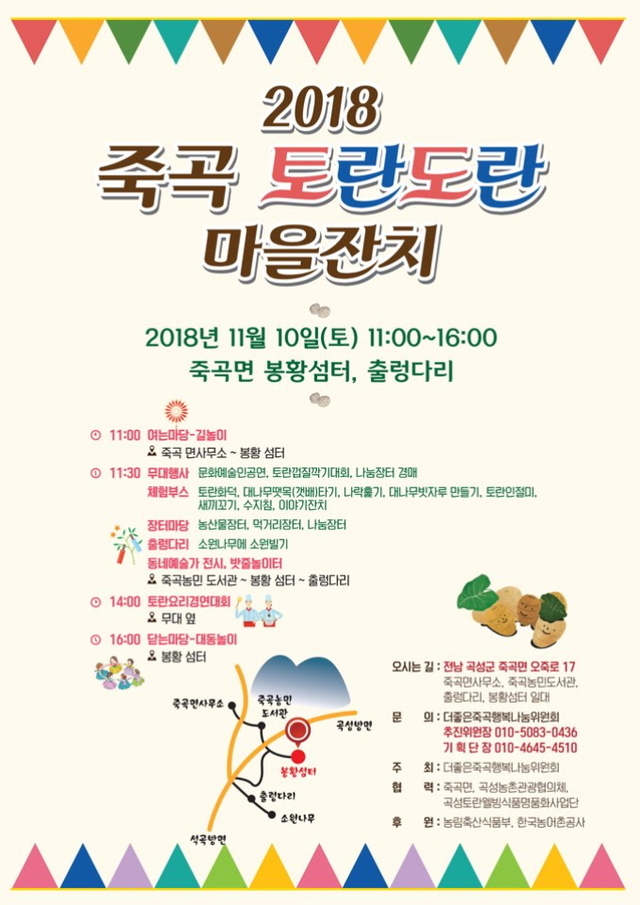 토란 주산지라는 자부심과 지역을 좀 더 살기 좋은 곳으로 만들고자 하는 주민들의 마음을 모아 오는 10일(토) 11시부터 죽곡면 봉황섬터에서 국내 최초 토란 축제인 ‘토란도란 마을 잔치’를 개최하게 된다.