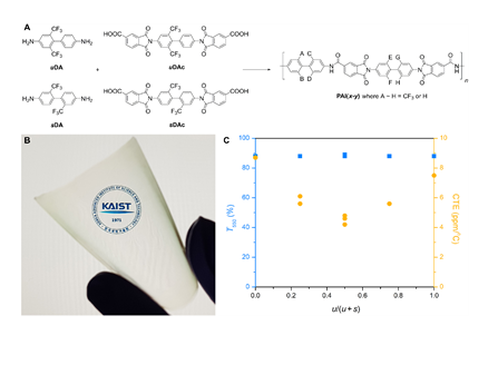 KAIST 화학과 김상율 교수 연구팀이 유리와 같은 투명성과 열팽창계수를 가져 유기소재의 열팽창 제어에 응용 가능한 고분자를 합성하는데 성공했다.