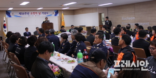 경남 사천소방서는 9일 제56주년 소방의 날을 맞아 사천소방서 3층 회의실에서 소방공무원, 내빈과 의용소방대원 등 130여 명이 참여한 가운데 소방의 날 기념행사를 개최했다.