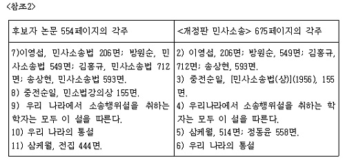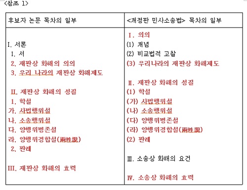 이 후보자의 1993년 논문 중 일부는, 3년 전인 1990년에 나온 강현중 교수의 <개정판 민사소송법> '제3편, 제3장, 제2절, 제3의 재판상 화해' 부분, 즉 667페이지부터 693페이지와 목차 그리고 글의 흐름이 상당 부분 유사하다.