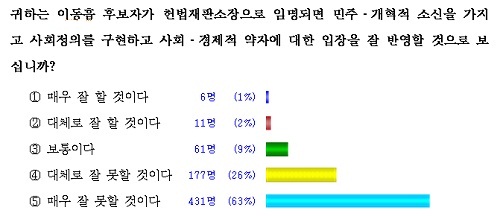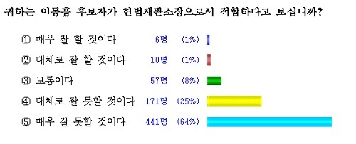 설문조사에 참여한 688명 중 "이동흡 후보자가 헌법재판소장으로 임명되면 민주·개혁적 소신을 가지고 사회정의를 구현하고 사회·경제적 약자에 대한 입장을 잘 반영할 것으로 보십니까"라는 질문에 "잘 못할 것"이라고 응답한 사람은 무려 608명으로 전체의 88%에 달했다. "잘할 것"이라고 응답한 사람은 전체의 3%인 17명뿐이었다.
