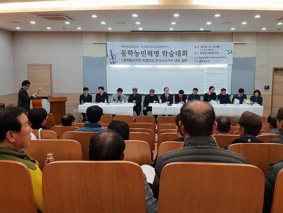 제1주제의 발표로 나선 서울대학교 김태웅 교수는 한국사교과서의 동학농민혁명 전개과정과 서술 변천과정을, 동국대학교 한철호 교수는 동학농민혁명 서술과 개선방향을, 동국대학교 조성운 교수는 동학농민혁명 학습자료의 변천에 대한 발표를 했다. 발표별로 서인원(진선여고 교사), 조교태(한성대 입학홍보처장), 강승호(과천여고 교사)와의 개별토론이 이어졌다.