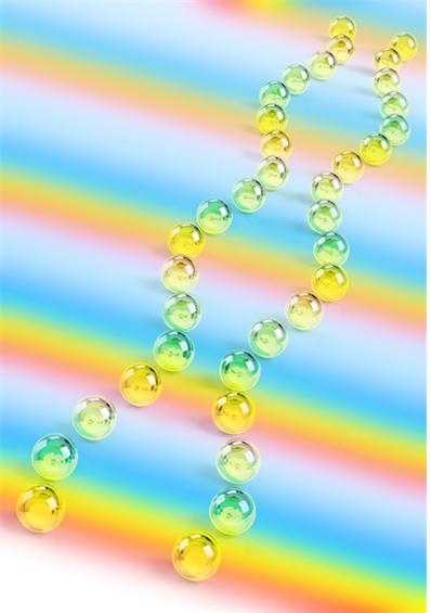 ▲나노입자의 움직임에 의해 펨토초 레이저 ‘광 빗’의 위상이 변화 : 시간에 따라 변화하는 금속 나노입자 쌍의 간격을 측정하기 위해서 광대역 펨토초 레이저 광 빗을 쏘아준다. 그러면 나노입자 쌍의 간격 변화에 따라 빛의 위상(무지개 빛)이 다르게 측정된다 ⓒ한국연구재단