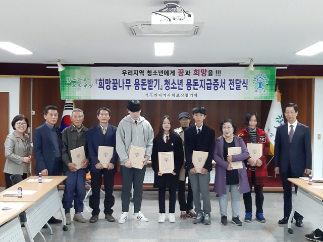 곡성군(군수 유근기) 석곡면 지역사회보장협의체가 지난 12일 석곡면 행정복지센터 회의실에서 석곡면 청소년 9명에게 『희망꿈나무 용돈받기』 용돈 지급증서를 전달하였다.