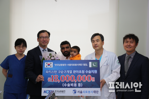 한국남동발전은 14일 국립 강릉원주대학교 치과병원에서 문창섭 한국남동발전 CSV처장과 서울의료봉사재단 박영욱 교수, 김재옥 이사 등 관계자들이 참석한 가운데 KOEN 미소드림 의료공헌사업 첫번째 수혜자인 파키스탄 구순구개열 환아(M.Faizan, 男 7개월) 및 가족을 위로방문하고, 수술비 등 후원금 1800만원을 전달했다.
