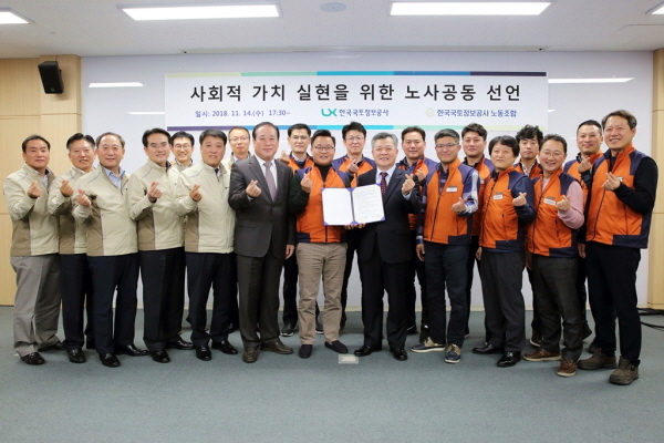 최창학 사장과 정광희 국토정보공사 노동조합 위원장을 포함해 40여명의 임직원이 참석한 가운데 열린 이날 회의에서 노사는 협력적 노사관계를 위한 열띤 토론과 함께 협력과 상생, 신뢰의 노사공동 선언문에 함께 서명 날인하는데 합의했다.