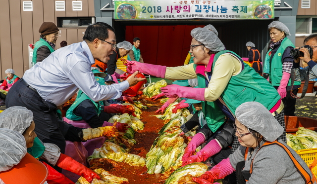 | 해마다 김장김치 나누기 행사를 통해 지역내 저소득가정 등에 훈훈한 이웃의 정을 느끼게 한 전북 익산시 새마을회가 올해도 어김없이 나눔을 이어가고 있다. 지난 12일부터 15일까지 4일간 팔봉공설운동장에서 정헌율 익산시장, 조규대 시의장, 이춘석 국회의원을 비롯한 시의원, 읍·면·동 새마을회원 등 450여명이 사랑과 정성으로 김치를 담갔다. 이렇게 마련된 김장김치 3000포기는 기초생활수급자 가정 등 저소득가정에 전달된다. 새마을회 조홍찬 회장은 “새마을회원 모두가 정성과 열정으로 하나 되어 마련한 김장김치 나누기 행사를 통해 주변의 어려운 이웃을 도울 수 있어서 보람되고 앞으로도 이웃사랑 행복사회가 만들어질 수 있도록 항상 앞장서서 노력하겠다”고 말했다. 한편, 익산시 새마을회는 읍면동 부녀회를 포함해서 약 1만포기의 김치를 담가 어려운 이웃에게 전달할 계획이다. |
