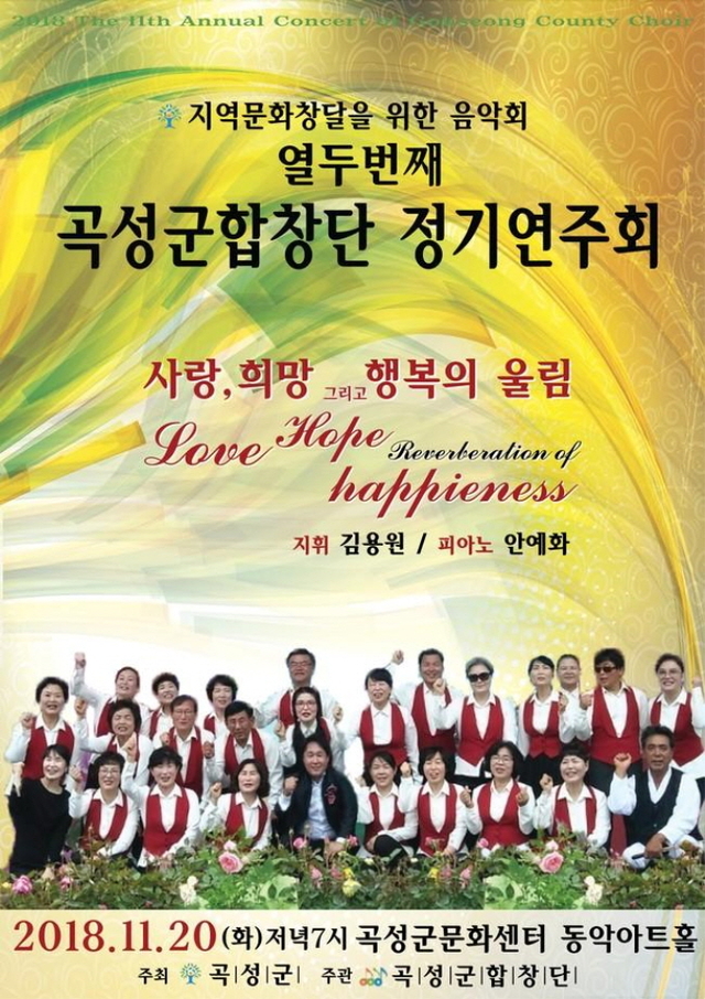 곡성군 합창단은 지역민들로 이루어진 주민합창단인 올해로 12회째 정기 연주회를 개최하며 인구 3만의 작은 농촌을 아름다운 소리로 채워나가고 있다.