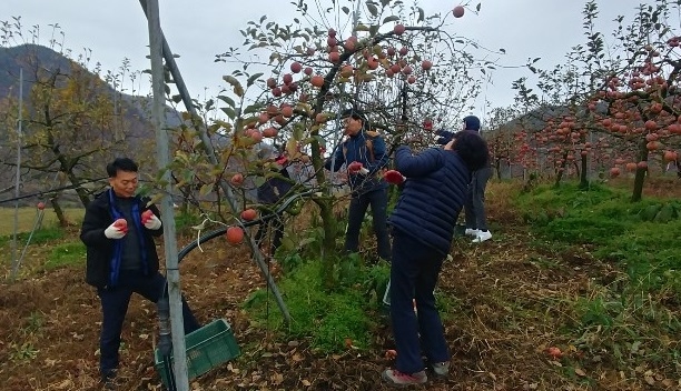 센터 직원들은 사과농장 수확 체험 및 일손 돕기와 함께 해당 농가에서 수확한 농산물도 구입했다.