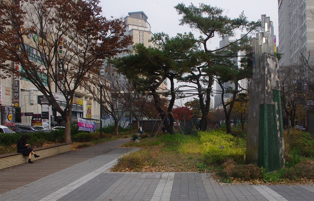 ▲주말 오후에도 한산한 유성온천 족욕장 주변 공원 ⓒ프레시안(육심무 기자)