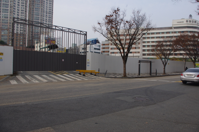 ▲건축물이 철거된 리베라유성 호텔 부지을 둘러산 가설 담장 너머로 유성호텔이 보인다 ⓒ프레시안(육심무 기자)