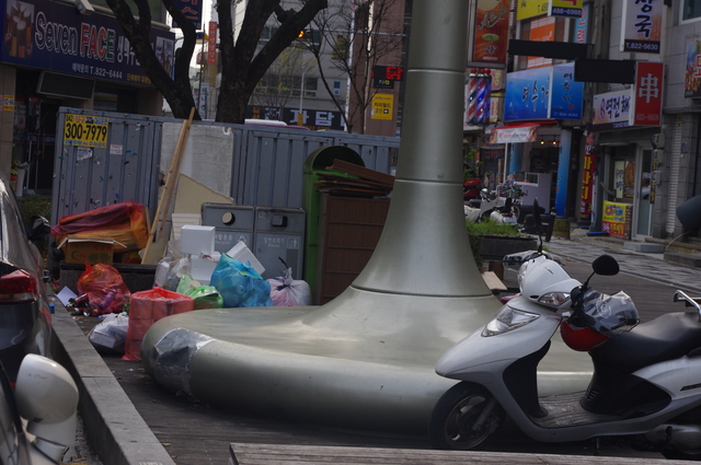 ▲쓰레기 투기와 이륜차 등의 불법 주차장으로 변한 유성 온천공원 앞 데크 ⓒ프레시안(육심무 기자)