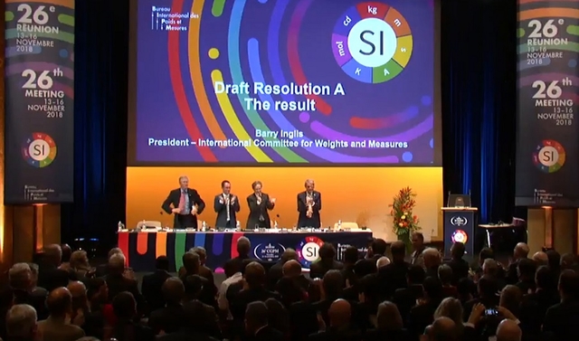 미터협약 가입 국가의 대표들이 참석한 이번 국제도량형총회 최종 투표에서 정회원국 만장일치 찬성으로 kg, A, K, mol 4개 기본단위의 재정의를 확정했다.