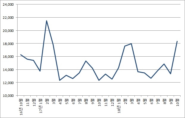 지난달 아파트 전월세 거래량은 1만8334건이었다. 월별 거래량 기준으로는 2016년 2월의 2만1509건 이후 가장 많았다. 10월 기준으로는 2014년 1만8347건 이후 최대였다.