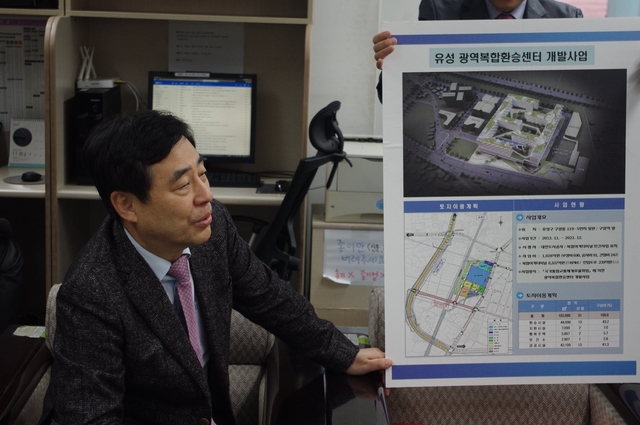 ▲ 유영균 대전도시공사 사장이 대전시 유성광역복합터미널 조성 사업 진행상황에 대해 설명하고 있다 ⓒ프레시안(육심무 기자)