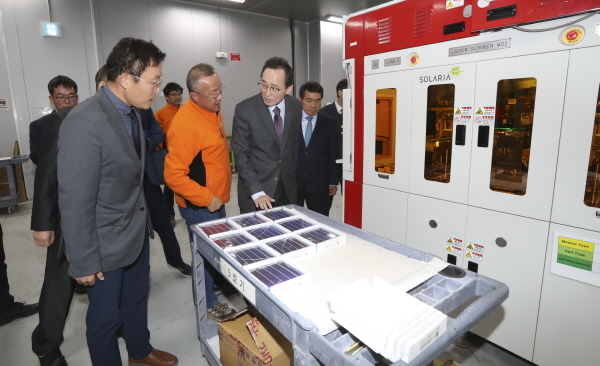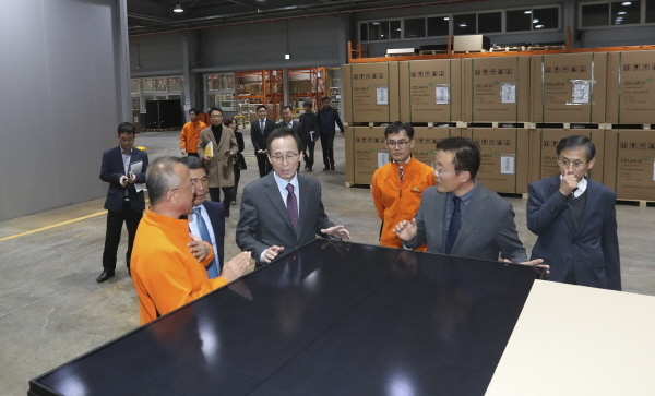 22일 완주 산업단지에 위치한 세계 최고 효휼의 태양광 모듈 생산기업인 ㈜솔라파크코리아에서 열린 재생에너지 관련 현장행정에 송하진도지사와 박성일 완주군수가 박현우 솔라파크코리아 대표로부터 친환경 태양광 모듈 생산 라인 및 생산 재품의 안전성에 대해 설명을 듣고 있다. ⓒ전라북도
