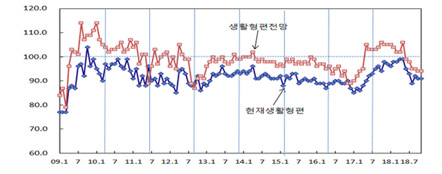 한국은행 대전충남본부에 따르면 현재생활형편CSI는 91로, 생활형편전망CSI도 94로 전월과 동일했다.