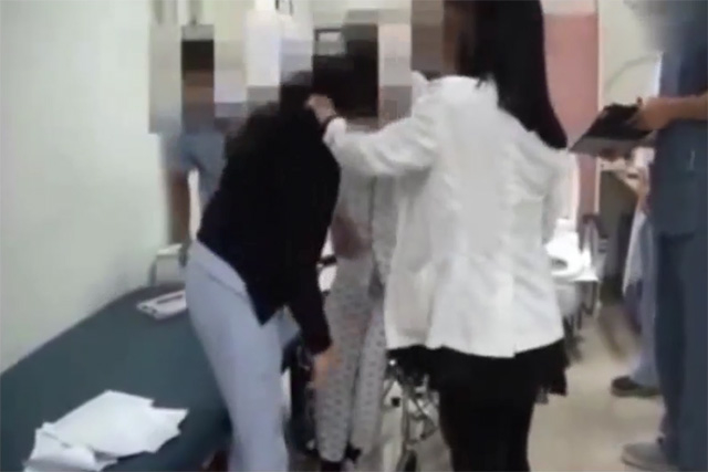 전국공공운수노동조합 의료연대본부 제주지역지부는 27일 제주대병원 H 교수가 직원들을 폭행한 장면이 담긴 영상을 페이스북을 통해 공개했다.(☞바로가기) 33초 분량의 영상 속에서 H 교수는 환자를 치료 중인 직원의 허리나 목 등을 꼬집거나 때리는 식으로 폭행을 가했다. 영상 말미에는 H 교수가 "때리는 거 찍었느냐"고 묻는 장면이 나오기도 한다.