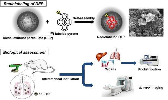 연구진은 자동차 디젤엔진에서 배출되는 미세먼지(1μm 미만)와 동일한 유형의 미세먼지 표준물질(DEP: Diesel Exhaust Particulates)과 방사성동위원소를 화학적으로 결합시킨 미세먼지 샘플을 실험용 쥐의 기도와 식도에 각각 투입하고 RI-Biomics시설의 핵의학 영상장비를 활용해 장기 내 DEP의 축적량과 장기들의 상태를 촬영했다.