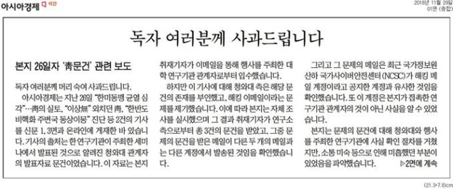 이 신문은 29일자 1면 사고(社告)를 통해 해당 문건의 진위여부를 확인키 위해 "청와대와 행사를 주최한 연구기관에 사실 확인 절차를 거쳤지만, 소통 미숙 등으로 인해 미흡했던 부분이 있었음을 파악했다"며 취재기자가 대학 연구기관 관계자로부터 입수했다고 알려진 문건을 담은 메일 계정이 "최근 국가정보원 산하 국가사이버안전센터(NCSC)가 해킹 메일 계정이라고 공지한 계정과 유사했음을 확인했다"고 밝혔다.