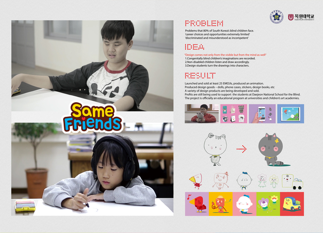 대전시교육청은 30일 대전맹학교(교장 최규붕)의 '시각장애 학생 디자이너 되기 캠페인 ‘Same Friends’' 가 2018 대한민국광고대상 프로모션 부문 은상을 수상했다고 밝혔다.