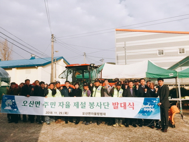 오산면 제설봉사단은 자율방범대원 20명으로 구성되어 있으며, 내년 2월말까지 운영된다. 이날 발대식에서는 도로제설에 대한 방범대원들의 의지를 다지는 결의문 선서, 도로제설 방법 및 장비 운용 교육이 진행됐다.