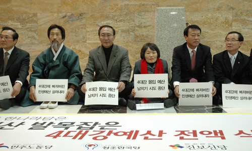 민주노동당 강기갑, 창조한국당 송영오, 진보신당 노회찬 대표를 비롯한 야3당 의원들은 28일 "이명박 대통령과 한나라당은 민생 예산 발목 잡는 4대강 사업 예산을 전액 삭감하라"며 "여당의 단독 처리를 막고자 무기한 공동 농성에 돌입한다"고 밝혔다.