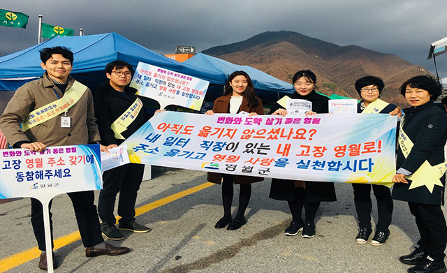 영월군은 최근 수년 간 지속적인 인구 유입을 위해 다각적인 노력을 전개하고 있으나 사망 인구가 늘고 관외 전출 증가에 따라 5일 공무원들이 덕포 5일장 입구에서 ‘내 고장 영월 주소 갖기’ 캠페인을 실시했다.