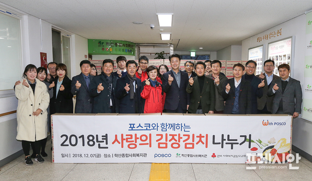 포항제철소는 7일 오후 5시 학산종합사회복지관에서 ‘사랑의 김장김치 나누기’ 전달식을 가졌다.