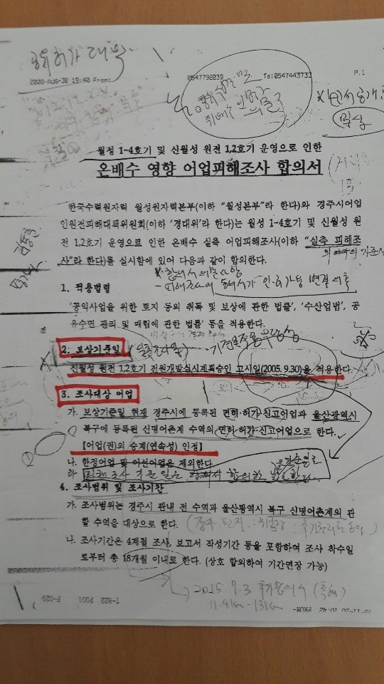 이 ‘문건’은 지난 2012년 12월24일 월성과 경주시어업인원전피해대책위(이하 ‘경대위’) 간에 ‘월성1~4호기 및 신월성 1.2호기 운영에 따른 온배수 영향 피해조사합의서’(이하 ‘합의서’)를 체결하기 전 상황으로 보여진다.