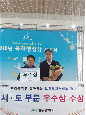 달성군은 시군구 부문 찾아가는 보건복지서비스 기반마련 분야에서 대상을 받았고 달서구는 우수상을 수상했다. 또 찾아가는 보건복지서비스 서비스 제공 분야에서는 남구가 대상을 서구는 우수상을 수상했다.