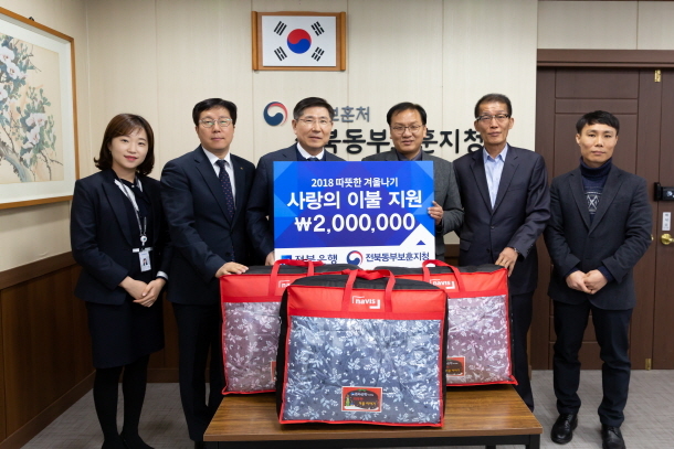전북은행은 전북동부보훈지청의 추천을 받은 국가유공자 및 유가족 가정에 200만원 상당의 순면 겨울이불 50채를 지원했다.