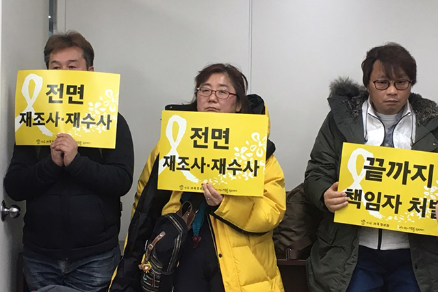 한편 이날 기자회견장에는 세월호 희생자 가족 50여 명이 와 방청했다. 이들은 '전면 재조사', '끝까지 책임자 처벌' 등이 적힌 손팻말을 들고 서 있었다.