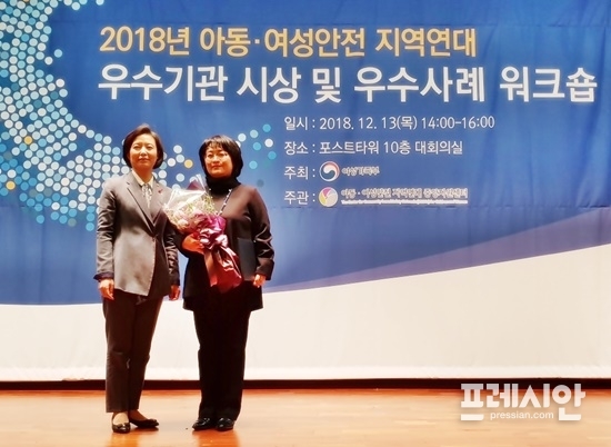 ‘지역연대운영부문’에서는 2년 연속 우수기관으로 뽑혔다. 이는 여성가족부 주관으로 전국 243개 지자체가 올 한해 추진했던 아동·여성안전지역연대 사업을 대상으로 평가한 것이다.