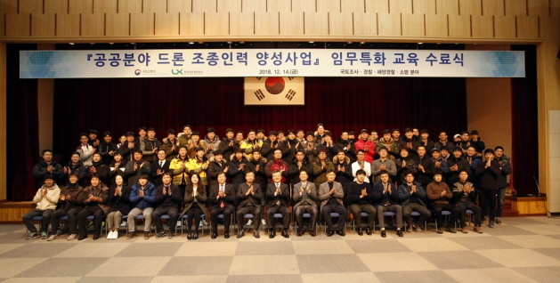 LX는 14일 전북 부안 신재생에너지테마파크에서 교육수료식을 개최하고 공공부문 75명, 민간부문 10명의 공공분야 임무특화 드론조종인력의 탄생을 알렸다.