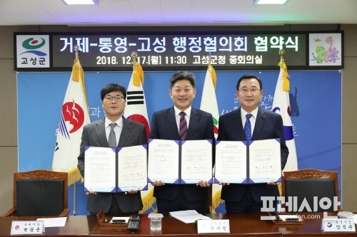 거제-통영 고성은 17일, 고성군청 중회의실에서 백두현 고성군수, 변광용 거제시장, 강석주 통영시장을 비롯한 담당공무원 등 30여명이 참석한 가운데 3개 시군 행정협의회 업무 협약을 체결했다.