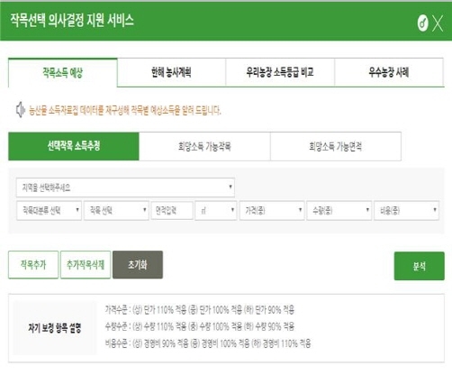 농촌진흥청은 재배 작목 결정 등 중요한 의사 결정을 망설이는 농업인들을 위해 180여 가지 작목으로 얻을 수 있는 소득을 예측할 수 있는 ‘작목선택 의사결정 지원 프로그램’을 경기도농업기술원과 공동 개발했다고 18일 밝혔다.