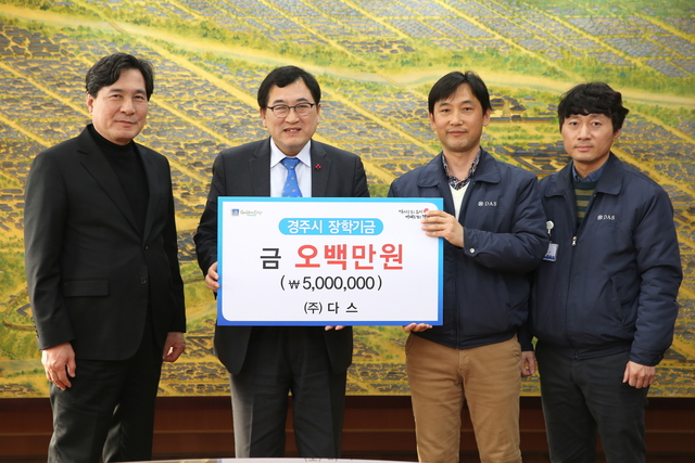 ㈜다스는 19일 경주시청을 방문, 동절기 안전 취약계층을 위해 300만원 상당의 소화기와 경보감지기 등 기초소방기기와 지역 인재육성을 위한 장학금 500만원을 경주시장학회에 기탁했다.