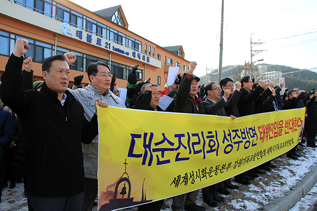 한편 태백시기독교회 연합회는 이날 1550여 명의 시민들이 서명한 특정종교 집단의 성지화 반대 서명부를 태백시 민원실에 접수한데 이어 태백시청 후문에서 50여 명의 목회자들이 모여 특정종교 성지화 결사반대집회를 펼쳤다.
