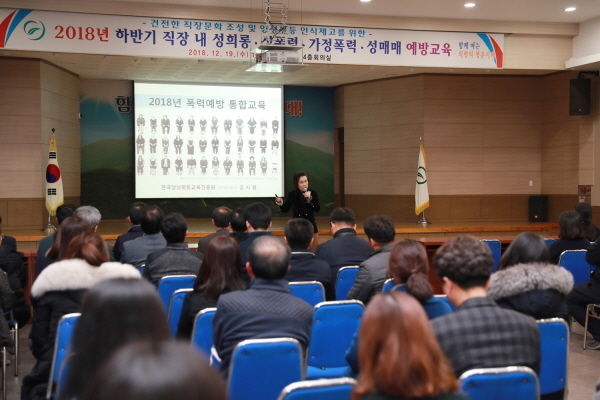 이날 교육은 한국양성평등교육진흥원 김시원 폭력 예방 통합교육 전문 강사를 초청해 성 평등 관점에서 성폭력 등에 대한 통합적 이해 및 성폭력 예방을 위한 직원의 인식 향상, 폭력 발생 시 적절하게 대처하는 방법 등을 강연했다.