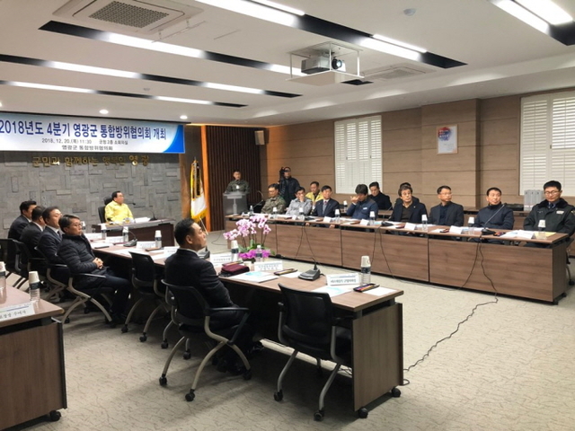 영광군(군수 김준성)은 지난 20일 군청 2층 소회의실에서 김준성 군수를 비롯한 유관기관장, 지역 사회단체장 등 통합방위협의회 위원 20여 명이 참석한 가운데 ‘2018년도 4분기 통합방위협의회’를 개최했다.