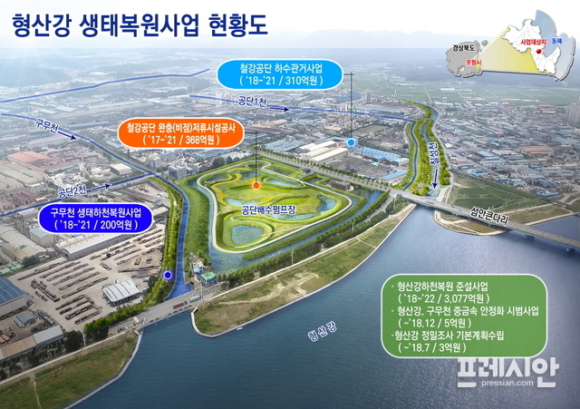 시는 또 올해 4월 환경부로부터 통합 집중형 오염지류 사업으로 선정된 3개 사업(완충저류시설 설치사업, 철강공단 하수관거 정비사업, 구무천 및 공단천 생태하천복원사업)과 2019년 형산강 본류의 하천복원 시범사업 신규예산 2억 원(총 사업비 495억 원)을 확보함에 따라 앞으로 차질없이 사업이 추진되도록 할 방침이다.