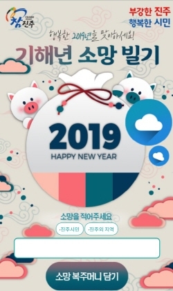 경남 진주시는 기해년 새해를 맞아 진주성에 설치된 공공와이파이를 이용하여 시민들의 한해 소망을 알아보는 ‘기해년 소망 적기’이벤트 행사를 운영한다고 23일 밝혔다.