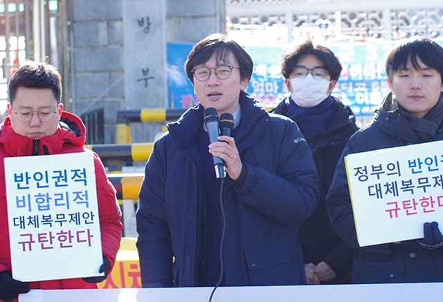 28일 국방부 청사 앞에서 국제앰네스티 한국지부, 군인권센터, 민주사회를위한변호사모임, 전쟁없는세상, 참여연대 등의 주최로 진행된 기자회견에서 국방부 대체복무제 도입 자문위원으로 활동했던 김수정 변호사, 박정은 참여연대 사무처장, 오재창 변호사, 임재성 변호사, 임태훈 군인권센터 소장 등 5명은 해당 법안에 심각한 우려를 표명하며 이같이 밝혔다.