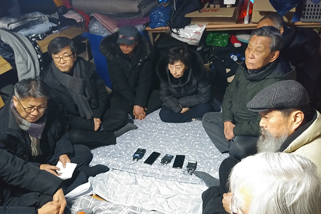 최 위원장은 박 사무장과 통화하기에 앞서 지상 농성 텐트에서 시민사회 중진들과 이야기를 나눴다.