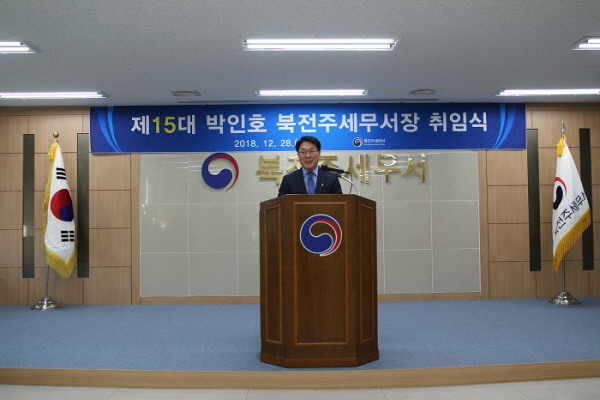 박인호 서장은 취임사를 통해 “오랜 역사와 전통이 빛나는 전주에서 근무하게 됨을 기쁘게 생각한다”며 “그 동안 세정발전을 위해 많은 노력을 하신 전임 채중석 서장님에게도 감사를 드린다”고 말했다.