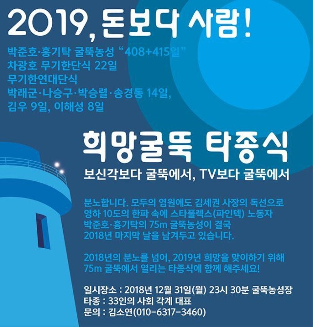 2019년 새 달력을 걸며 새로운 한 해를 시작하려는 굴뚝 노동자들에게도 새 달력을 선물해주자. 새해의 첫 일출을 또다시 굴뚝에서 맞이하게 하지는 말자. 파인텍 노동자들이 가족들과 함께 새 달력을 걸며 2019년을 시작할 수 있도록 굴뚝을 향해 힘껏 손을 흔들어 주자. 이는 나의 꿈을 응원하는 일이기도 하니까.